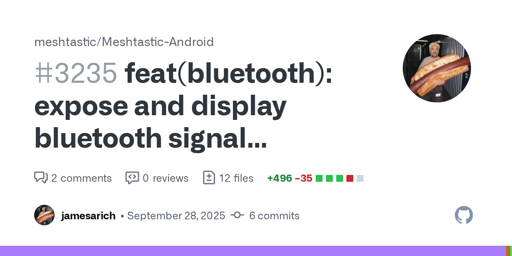 shortwavesurfer@lemmy.zip · 20 days agofeat(bluetooth): expose and display bluetooth signal strength (RSSI) by jamesarich · Pull Request #3235 · meshtastic/Meshtastic-Androidplus-squaregithub.comexternal-linkmessage-square0linkfedilinkarrow-up11arrow-down10