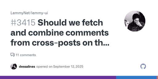 Dessalines@lemmy.ml to Lemmy@lemmy.mlEnglish · 2 months agoLemmy community feedback: Should we fetch and combine comments from cross-posts on the post screen? · Issue #3415 · LemmyNet/lemmy-uigithub.comexternal-linkmessage-square34linkfedilinkarrow-up12arrow-down10