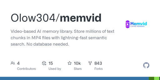 arrow-up11arrow-down1external-linkVideo-based AI memory library. Store millions of text chunks in MP4 files with lightning-fast semantic search.github.comcyrano@lemmy.dbzer0.com to datahoarder@lemmy.ml · 5 months agomessage-square0linkfedilinkfile-text