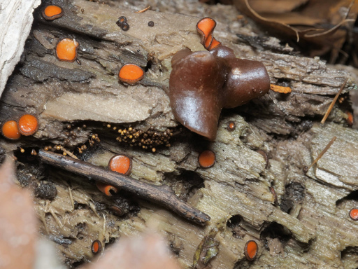 I’m only guessing here, but it looks like the large brown shroom is copper penny fungus. The orange cups are common eyelash, and the slimes could be many things.
