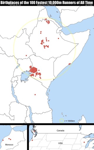 Birthplaces of the 100 fastest 10km runners of all time