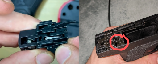 The upside of the design on the Rock is that the disconnector is actuated by the rails of the slide instead of the internal surface. There’s a small pin that extends out and sits below the bottom of the slide rails and pops up with the disconnector. This should reduce wear and tear of the slide the way it’s seen on the TX22.
