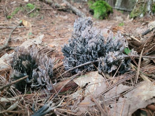 Maybe Clavulina sp. they often get infected with another fungus that turns them grey.