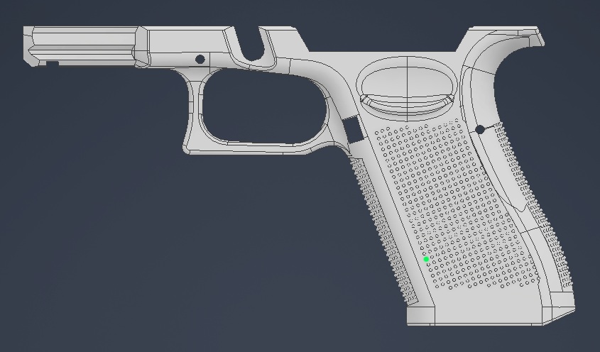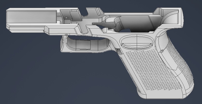 I wanted a gen 5 model to start with so that I could fill in most of the internals and then use the G100 boolean negative to subtract away what I need to make it compatible with the G100 fire control unit. All that its really going to do is make it look like a gen 5 glock externally and also gen 5 mag release. I guess its not that important because I’ve already found a 19x file that was gen 3 compatible and modified it to accept the g100 chassis. I was just hoping that there was a gen 5 replica model somewhere to start with so I could make one more true to an actual gen 5 frame. I haven’t tried printing yet but I modified this model the past couple days. The biggest hiccup was recontouring the back strap because the G100 chassis is really deep in the trigger housing area because it holds the trigger housing and then also has more material under it for a mounting pin. This makes it dangerously thin in the backstrap around where the pin is. So I added about 1mm more material to the backstrap while trying to maintain the same hump and contour.