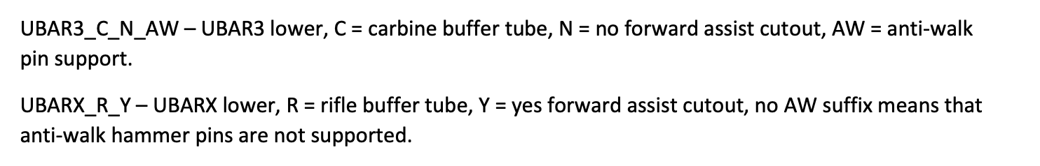 It’s in the build tutorial. Do you want a Carbine or Rifle buffer tube? Does your upper have a Forward Assist? Will you use anti-walk pins for your FCG? The UBAR-X has an integrated grip and the regular allows you to add your own grip.