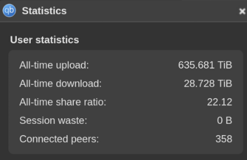 These stats capture 1 year of torrenting on a TrueNas scale machine I built as soon as fiber showed up on my street. It was my first ever proper rack mount server. I use this machine primarily for torrenting and jellyfin transcoding via an RTX 2080. The plan is to soon set it up for navidrome. Machine sits around 230 watts. Feel free to offer TrueNas scale tips.