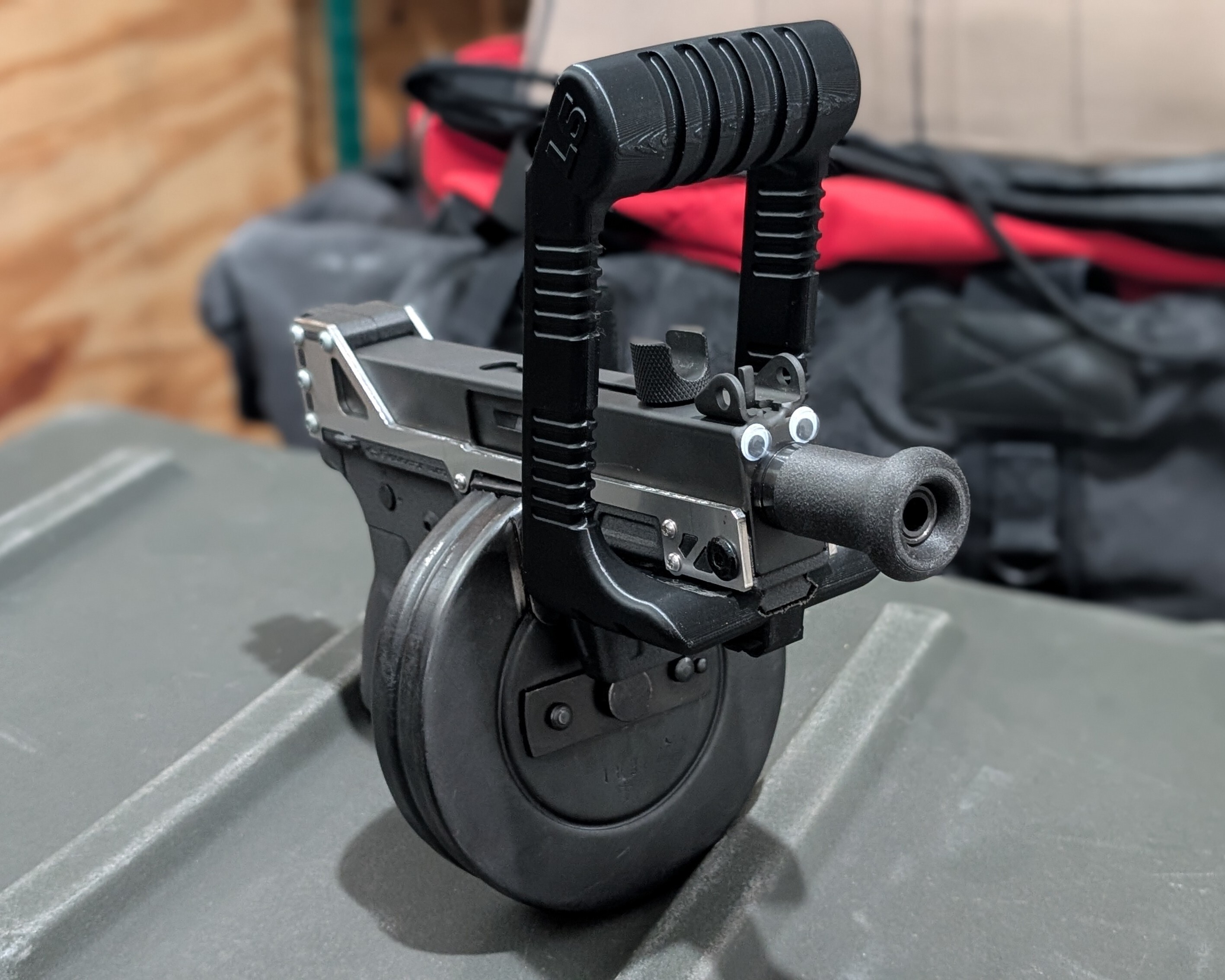 Test fitting the chainsaw grip to see if it works on the Alloy drum version. I printed the tall version of the grip for the top charging upper. You might be able to use the wide version with the side charge uppers, I haven’t checked the clearance for those.