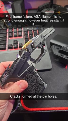 Fortunately did not have this happen while firing. I noticed the cracks when inspecting the gun at my desk, flexed it, and it completely snapped.
