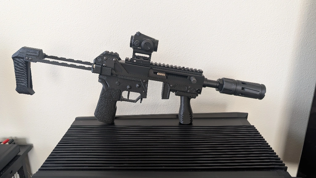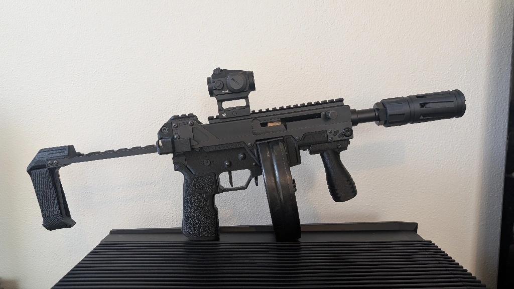 Test fitting the chainsaw grip to see if it works on the Alloy drum version. I printed the tall version of the grip for the top charging upper. You might be able to use the wide version with the side charge uppers, I haven't checked the clearance for those.