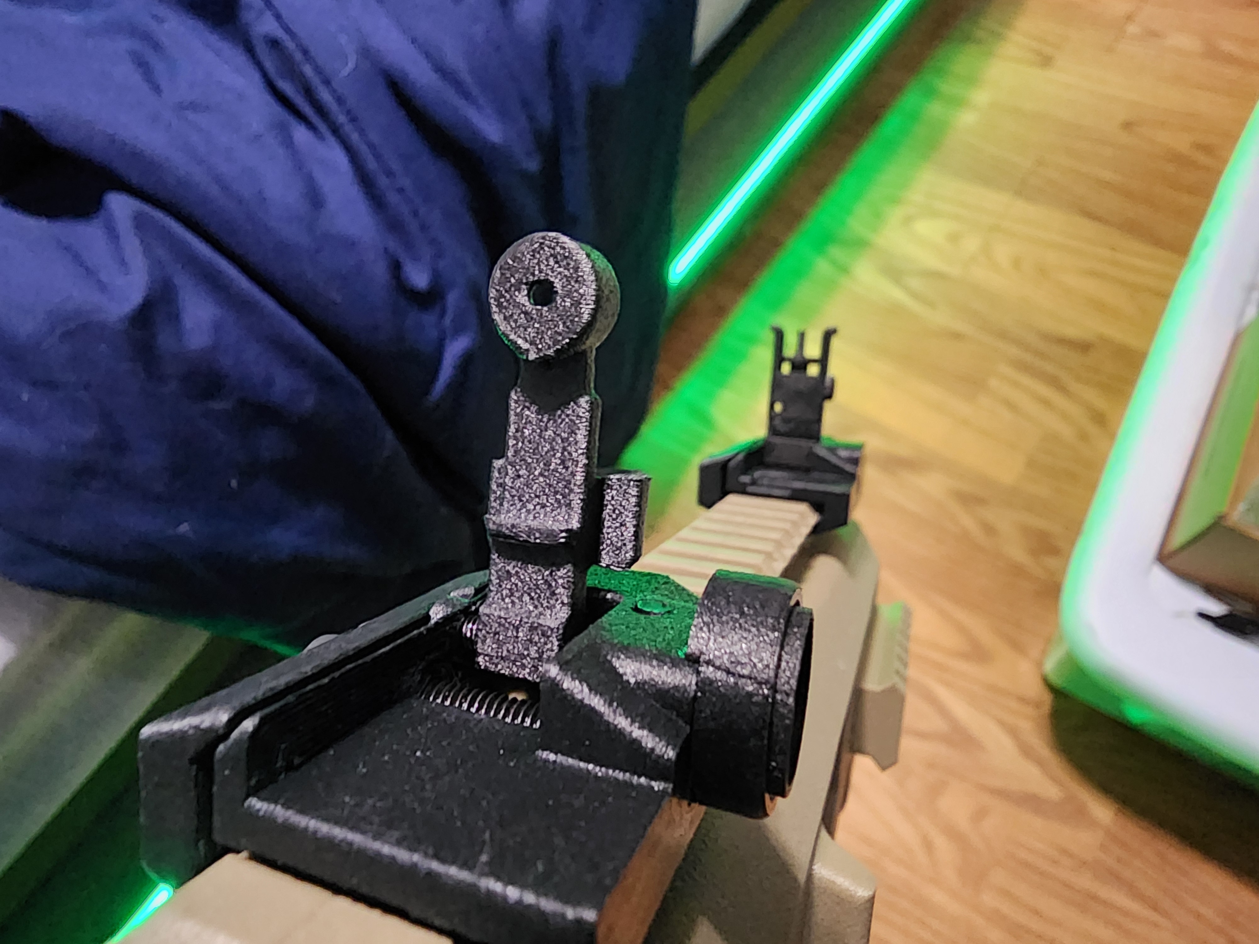 Fully functional windage and elevation adjustments as per the real steel. There's a hole in the front sight for a setscrew to adjust elevation when folded. The front sight post can be adjusted up and down for elevation by screwing it in and out, theres a printed detent that makes it tight enough to never move unless you purposely adjust it (shes on
