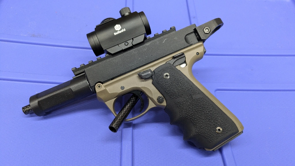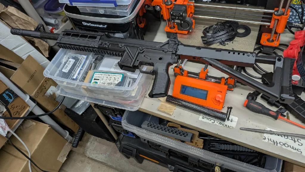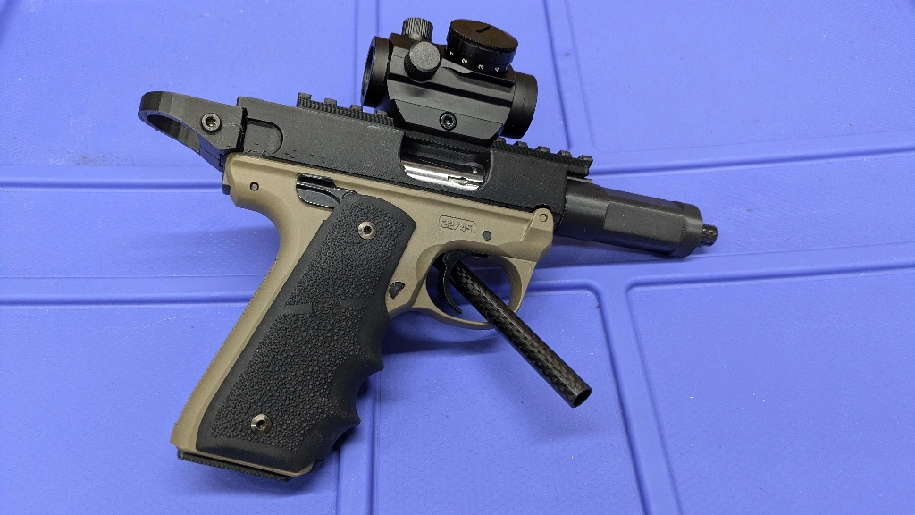 So for this particular build, I have the Ruger 22/45 frame, Ruger bolt and printed pull ring, printed receiver, barrel plug, carbon fiber tube and the 22lr barrel liner inside that tube, stock Ruger magazine and printed 22/45 base plate.